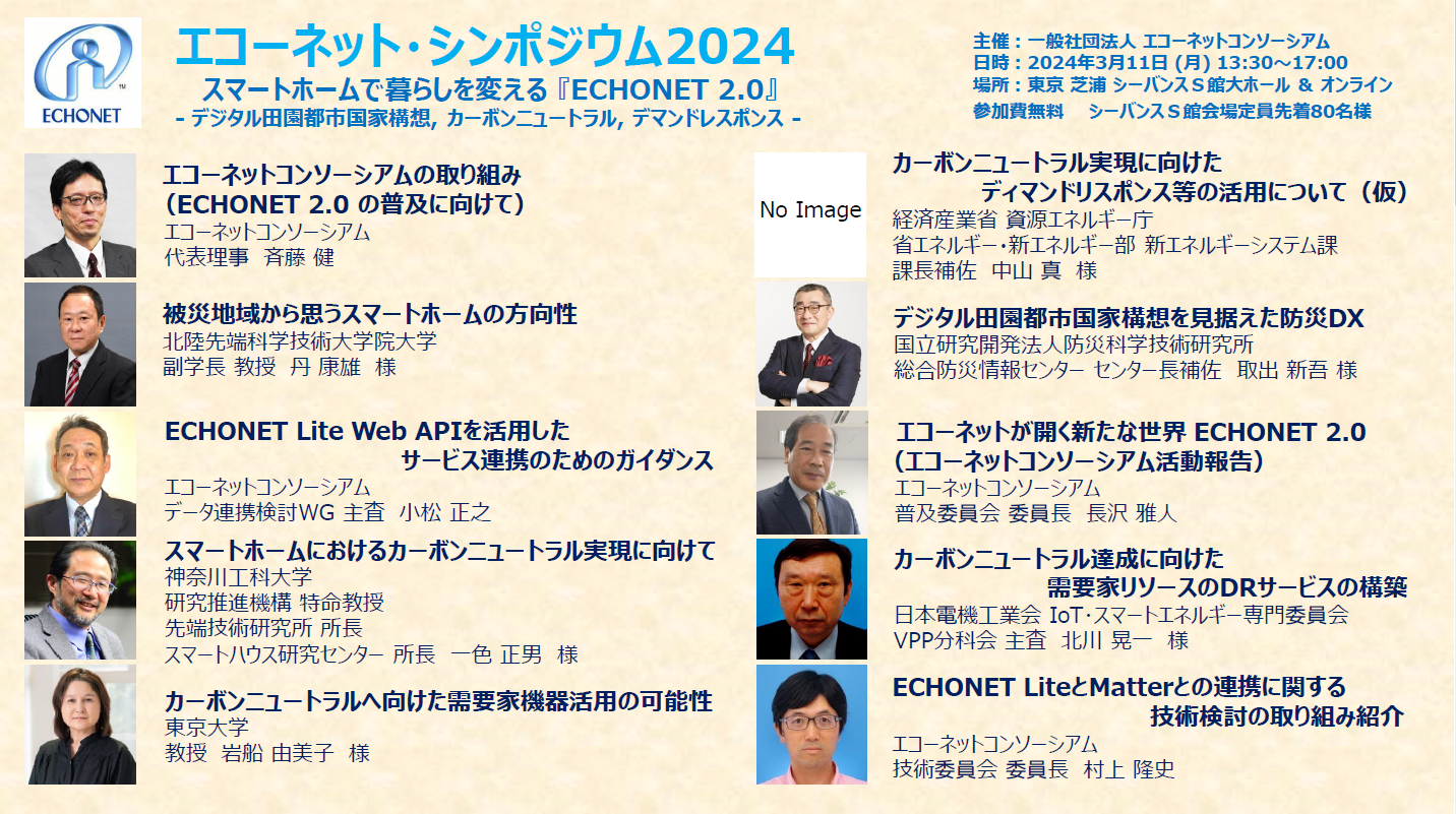 | 名称 | エコーネット・シンポジウム2024 スマートホームで暮らしを変える 『ECHONET 2.0』 |
