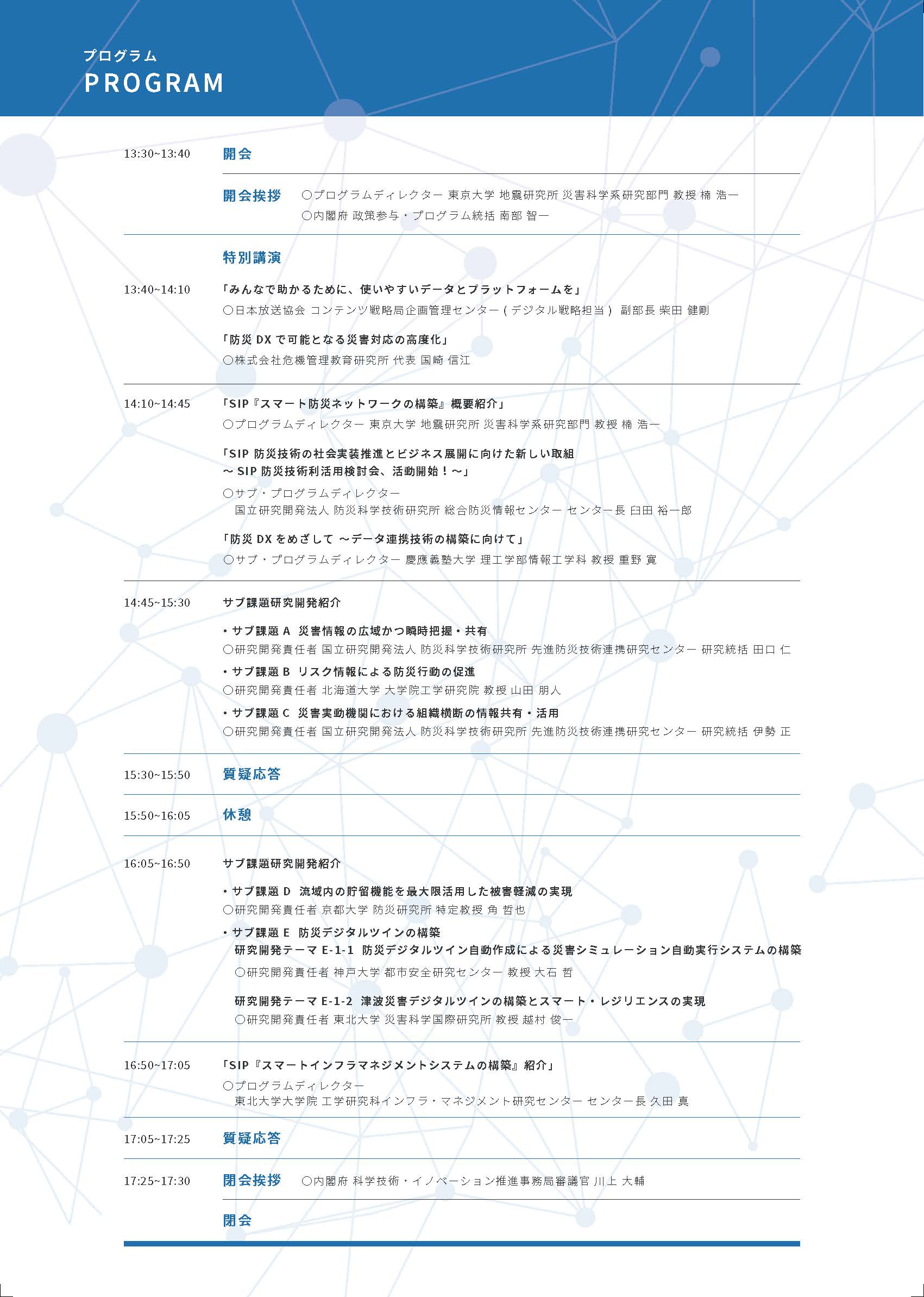 2024年10月29日(火)に開催されますSIP「スマート防災ネットワーク」シンポジウム2024に研究開発責任者の田口仁が登壇し、サブ課題Aの研究内容を紹介致します。
