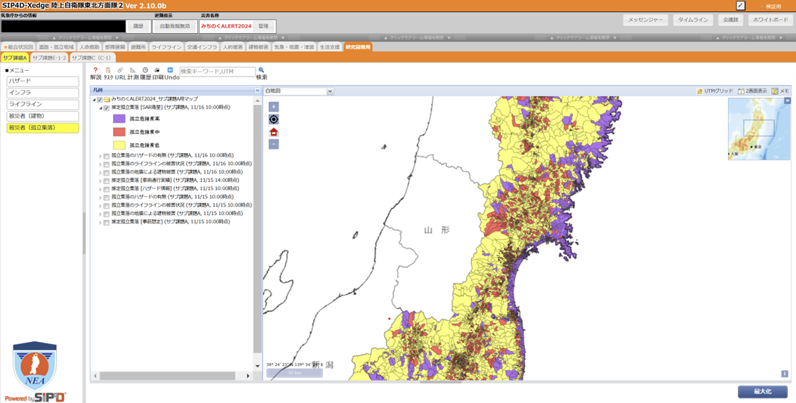 SIPのサブ課題間データ連携として、サブ課題Aの被害推計情報をサブ課題Cが開発しているSIP4D-Xedgeに共有し可視化する実証実験を行いました。SIP4D-Xedgeへのデータ連携により、陸上自衛隊などの実働機関がサブ課題Aの被害推計情報を迅速に把握し、より効果的な災害対応を行うことが期待されます。