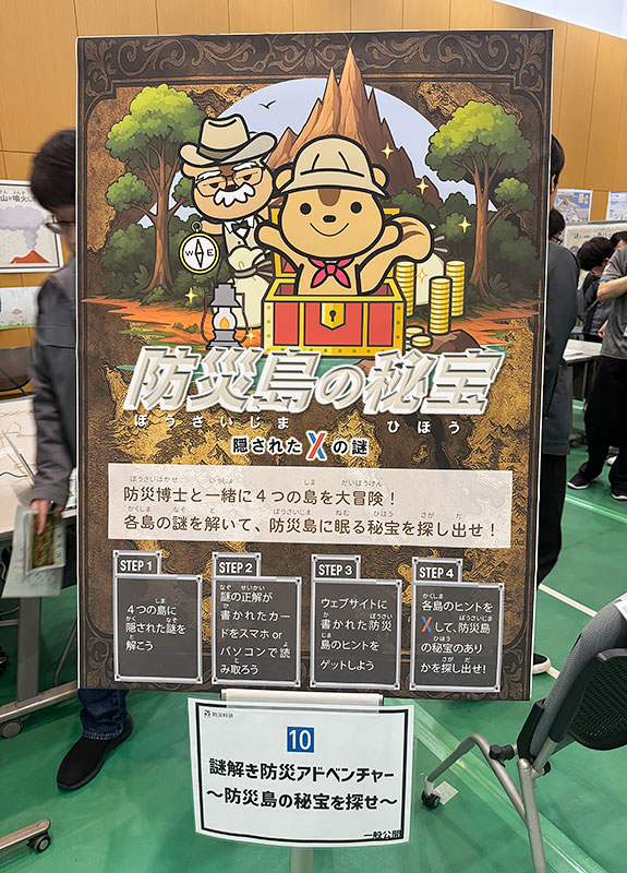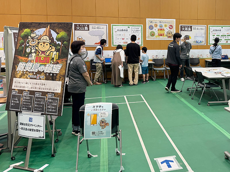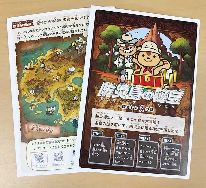 地震島、火山島、大雨島、大雪島の4つの島で謎を解いてヒントをもらい、 「防災島の地図」にある記号から本物の宝物を探し出す、という謎解き防災アドベンチャーになっています。