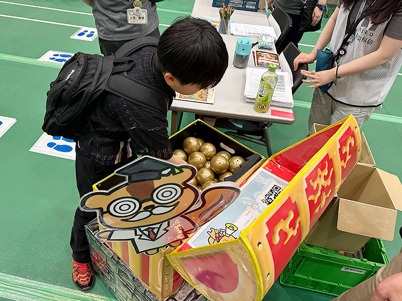 すべての謎に正解しアンケートに答えると、宝箱から金塊に見立てた金のガチャガチャを一つ引くことができ、防災に役立つ情報(コレチェク・防災グッズリスト)や缶バッジをもらうことができます。