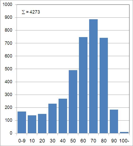 現時点で身元の確認された4千名余りの方々の年齢分布を作ってみました。