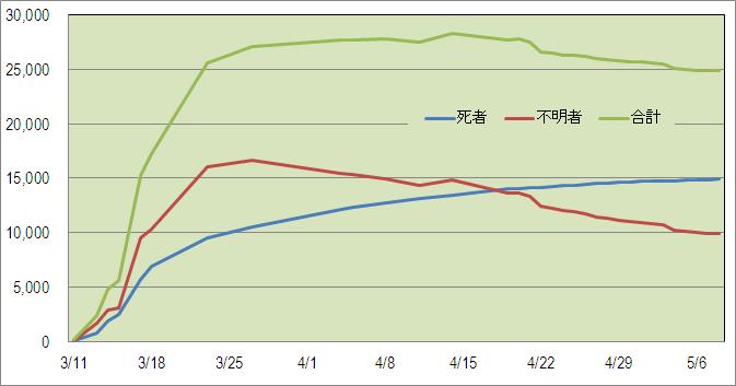 これを見てわかることは、災害発生後2週間ほどでいったんピークとなり、その後、行方不明者数が減るのに対して、死者数が徐々に増えていくという傾向です。当然と言えば当然ですが、行方不明だとみられていた方の遺体が発見され、身元が特定されることで、確定死者数が増えていくのが見て取れます。一方で死者+行方不明者の数字については4月の下旬ごろから徐々に減っていることがわかります。これは何を意味するのでしょうか。