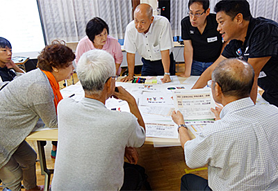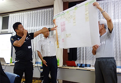 ワークショップでは、グループごとに発災時の安否確認、避難場所などの課題が議論され、最後の発表で全体に共有されました。