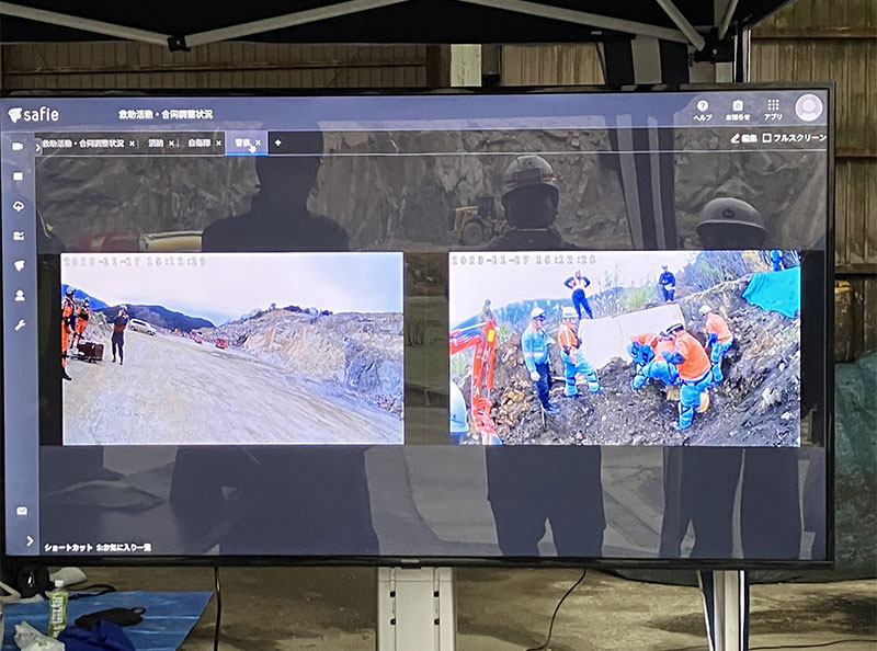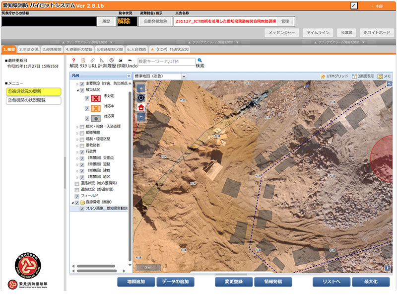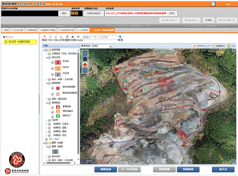 この救助訓練では、大規模土砂災害を想定したブラインド型訓練で行い、陸上自衛隊、警察、消防により被災状況偵察を行い、ICT技術を活用した被災状況のリアルタイム共有等を行う実動訓練を行い、これらの状況はSIP4Dを介して愛知県災害情報センター及び関係機関と共有しました。