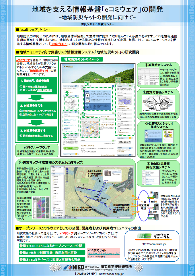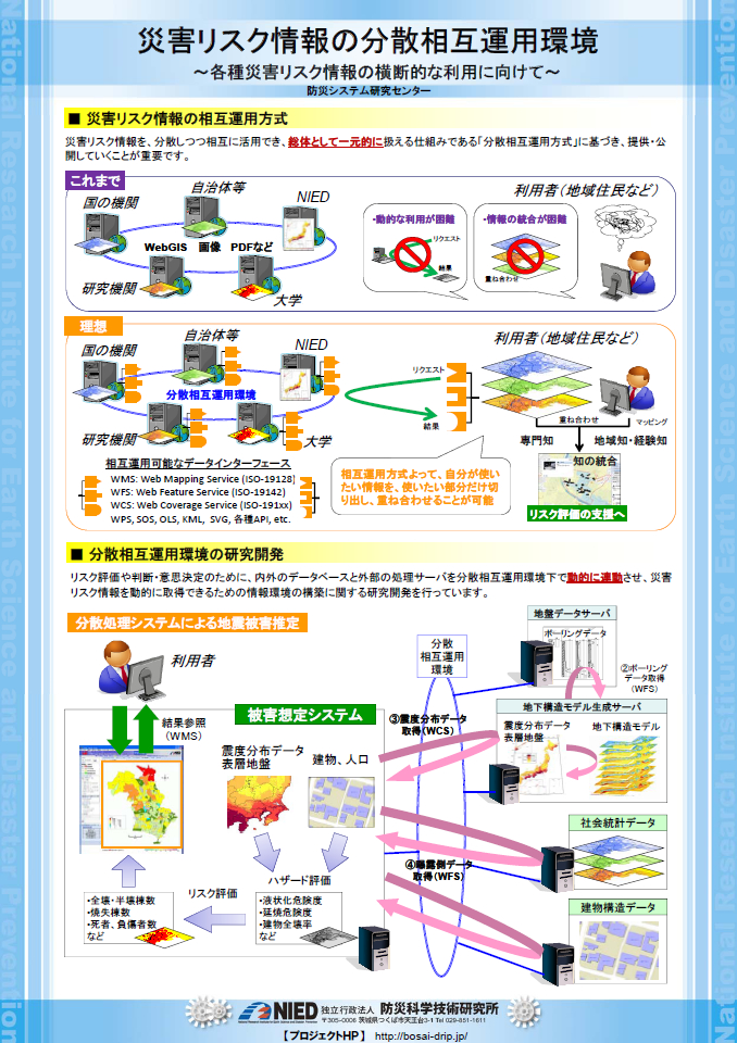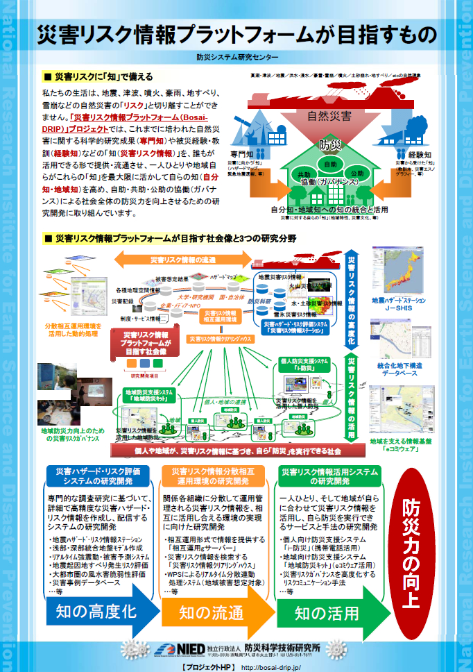災害リスク情報や地域防災力の研究領域リスク研究グループの研究テーマを紹介します。 1.災害リスク情報プラットフォームが目指すもの → 災害リスク情報プラットフォームが目指すもの(PDF) 2.災害リスク情報の分散相互運用環境 ~各種災害リスク情報の横断的な利用に向けて~ → 災害リスク情報の分散相互運用環境(PDF) → 分散相互運用についての詳細 3.地域の防災力向上のための災害リスクガバナンス → 地域の防災力向上のための災害リスクガバナンス(PDF) 4.地域を支える情報基盤「eコミウェア」の開発 ~地域防災キットの開発に向けて~ → 地域を支える情報基盤「eコミウェア」の開発(PDF)